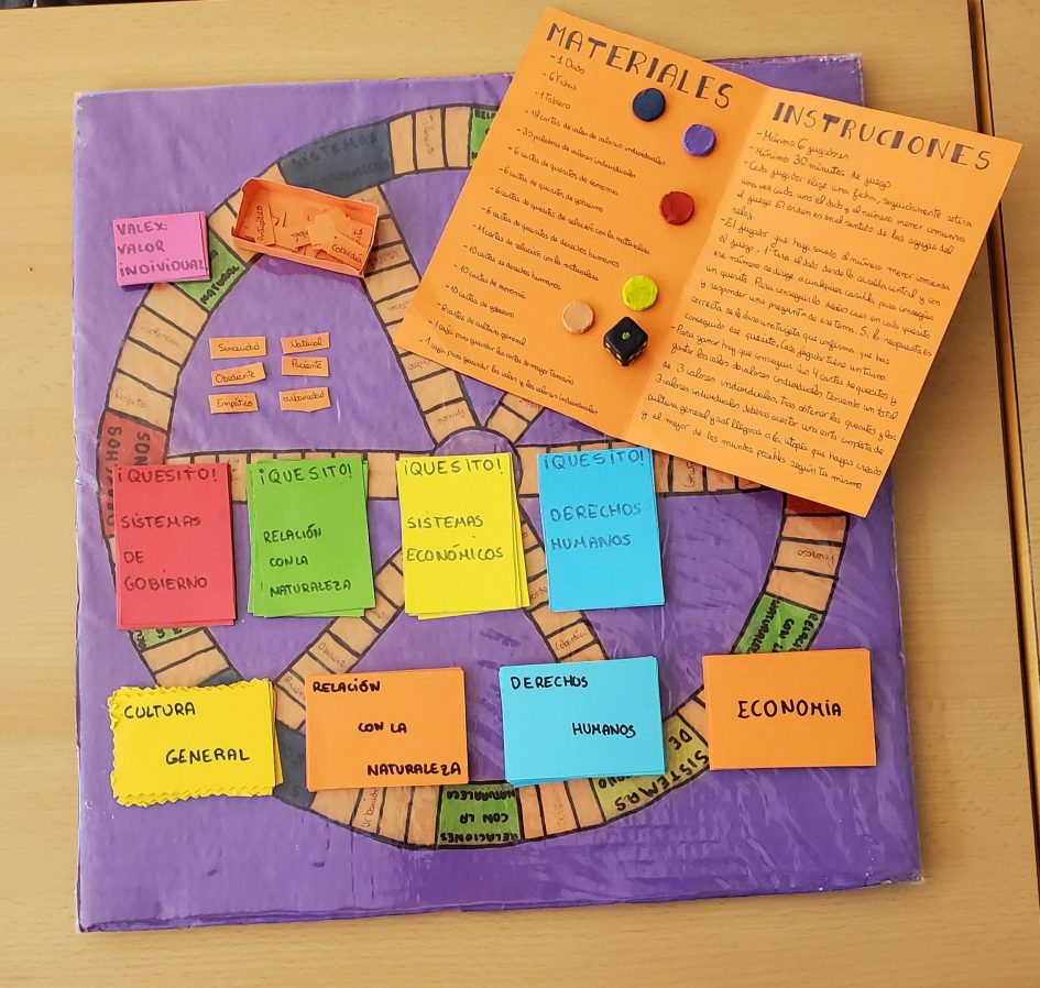 Para hacer este juego, nos hemos basado en el trivial y el monopoly. Del trivial hemos utilizado la idea de su tablero y la de su dinámica de conseguir quesitos. Y del monopoly, caer en distintas casillas y conseguir valores. Y en común de los dos juegos, hemos decidido hacer preguntas relacionadas con la asignatura de valores: economía, sistemas de gobierno, derechos humanos, relaciones con la naturaleza, cultura general.