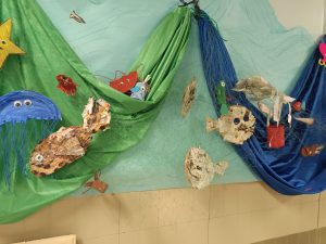 Las clases EBO II H y J que certifican los retos para ser Aula Verde del colegio la Corolla le enseñaron la red “la mar de plásticos”. Además, colocaron un pez y una medusa fabricados por alumnado de su centro con residuos recogidos de un paseo por su entorno.