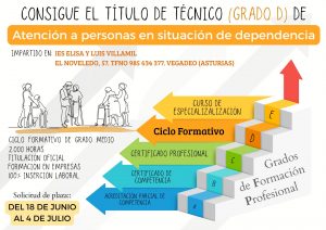 El miércoles 18 de junio comienza el plazo para la inscripción en el Ciclo Formativo de Grado Medio «Atención a personas en situación de dependencia» que se imparte en el IES Elisa y Luis Villamil de Vegadeo.