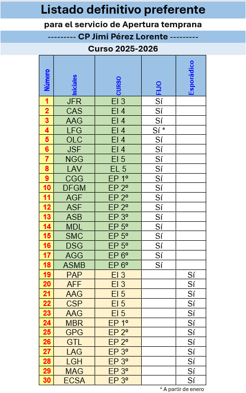 El listado anteriormente expuesto, es de las familias que han solicitado el servicio de Apertura temprana, justificando la necesidad. No todos los días todas las familias que han apuntado a su hijo/a de manera esporádica va a utilizar el servicio, por lo que si alguna familia que no esté en el listado lo desee usar, se recuerda que llame a la monitora Mar para comprobar que ese día hay plaza. En el caso de más plazas de 30, se dará prioridad al listado anterior como alumnos/as preferentes.
