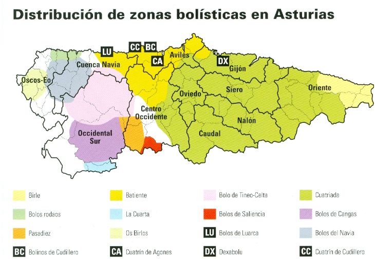 Un mapa muestra la distribución geográfica de las modalidades bolísticas asturianas.