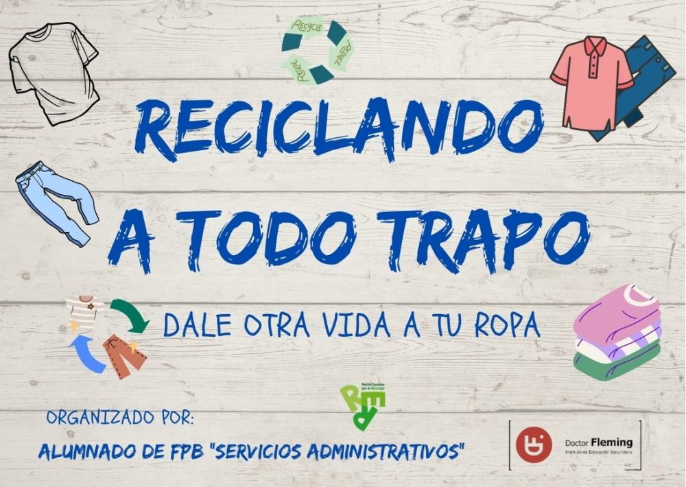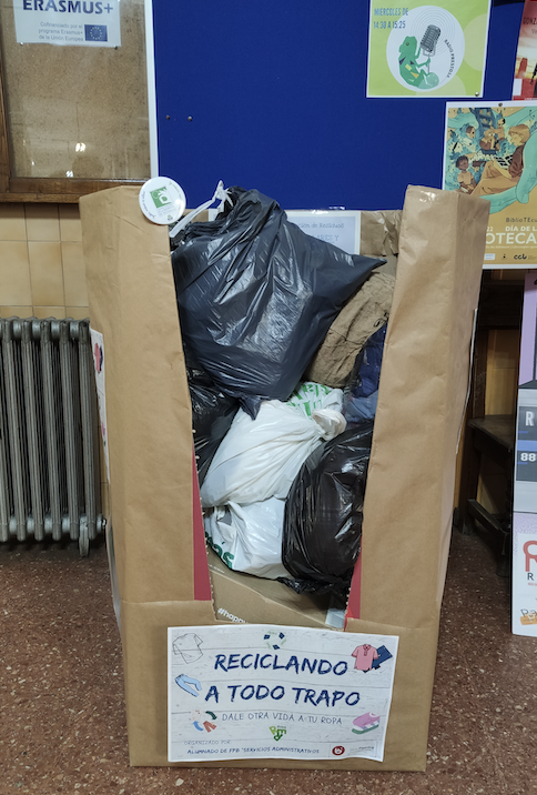 Durante esta semana se han colocado tres cajas de cartón (una en cada edificio) con el lema «RECICLANDO A TODO TRAPO», para que toda la comunidad educativa deposite ropa que no utilice y quiera darle una segunda vida a través del reciclaje textil.