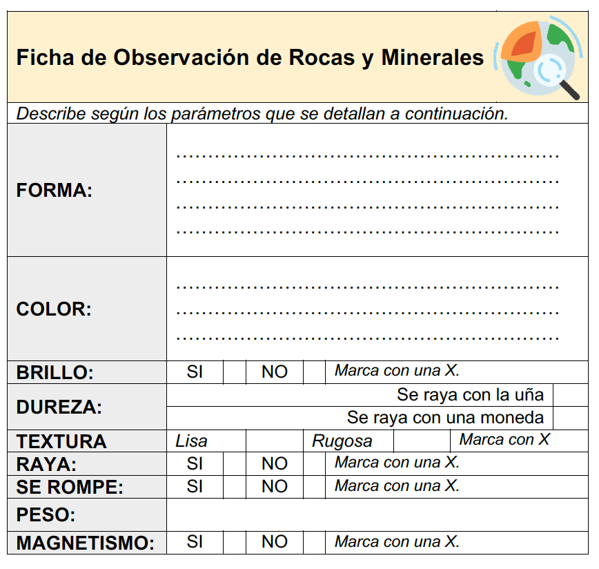 Habitualmente las rocas y los minerales se estudian con una ficha de observación como esta: