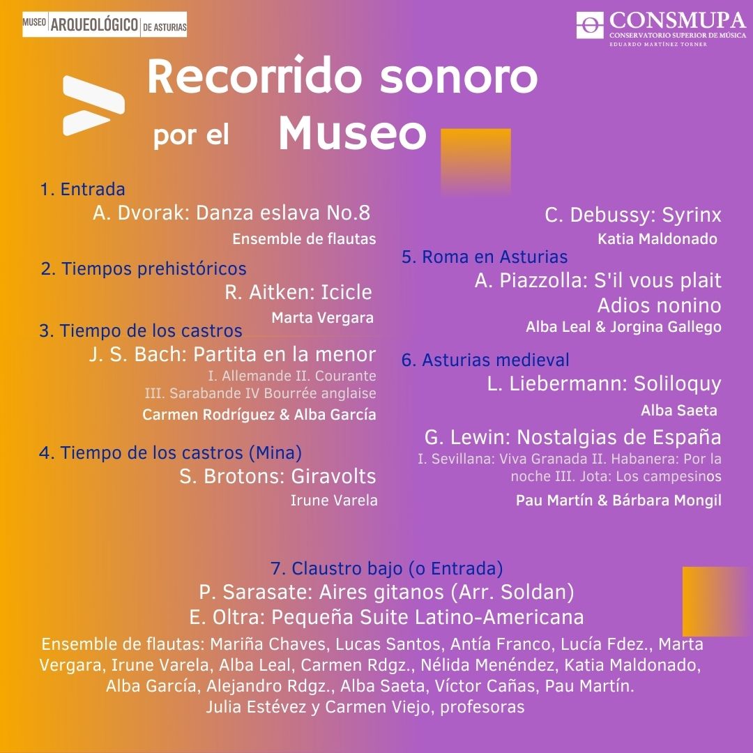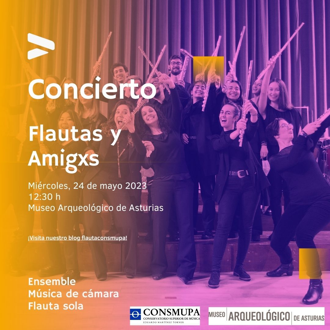 Después de una dura semana de exámenes, os presentamos nuestro concierto de fin de curso. Nos desplazaremos al Museo Arqueológico de Asturias para interpretar algunas obras con el ensemble de flautas, nos acompañarán algunos alumnos de música de cámara y también se interpretarán obras de flauta sola desde Bach hasta Liebermann o Brotons.