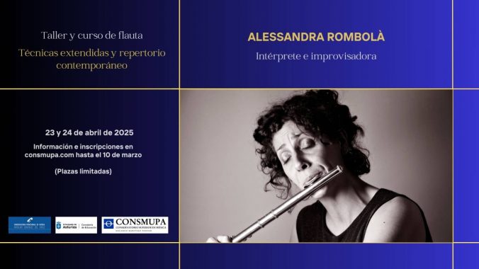 Mediante el formulario que figura en la página web del CONSMUPA podrá realizarse la inscripción para el Taller y curso de flauta: Técnicas extendidas y repertorio contemporáneo con Alessandra Rombolà, que se celebrará en el Consmupa los días 23 y 24 de abril, de acuerdo al siguiente calendario: