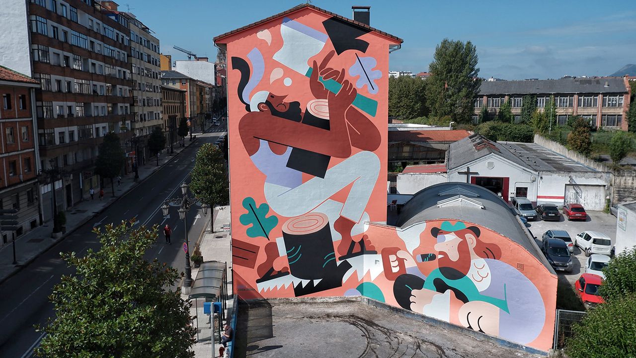Mural sobro «la curtia d’árboles con hachu y tronzón» na Tenderina Alta (Uviéu). Esti deporte tradicional asturianu ta equí inmortalizado dende’l festival Parees 2019 (by Hedof & J.Joshua). La imaxe reflexa a 2 participantes cortando’l tueru d’un árbol con hachos y sierres pa formar una torre coles sos estielles.
