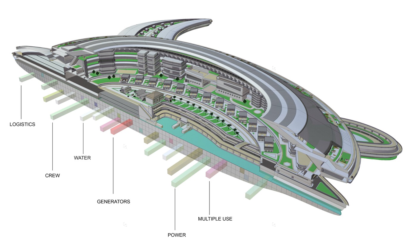 El proyectu, diseñáu con forma de tortúa, consiste n’una “ciudá flotante” que va cuntar con hoteles, cases de luxu, parques, centros comerciales, amás d’un un aeropuertu, con aviones propios, y helipuertu. El so funcionamientu va ser sostenible, cuidao que va cuntar con nueve motores de 16.800 hp eléctricos que van recibir la enerxía que precisen de los paneles solares alcontraos nel cascu” de la embarcación.