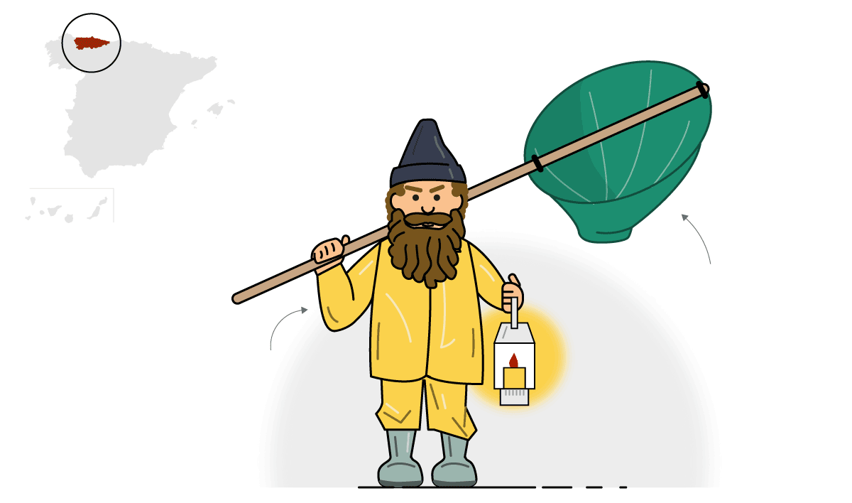 Asturies: Porta un salabre pa pescar y un candil. Paxellu de pescador con traxe impermeable mariellu y botes