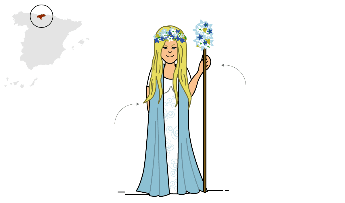 Cantabria: Vara de fresnu pa faer los sos encantamientos. Visti llargues trences doraes y guirlandes de flores monteses nel pelo.