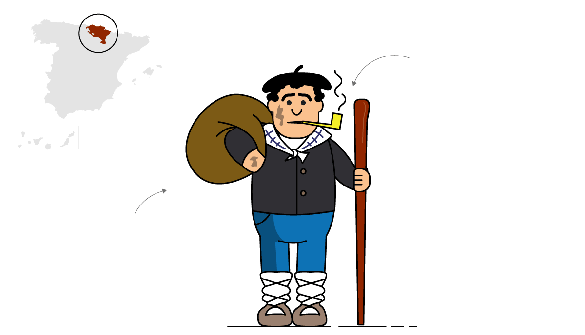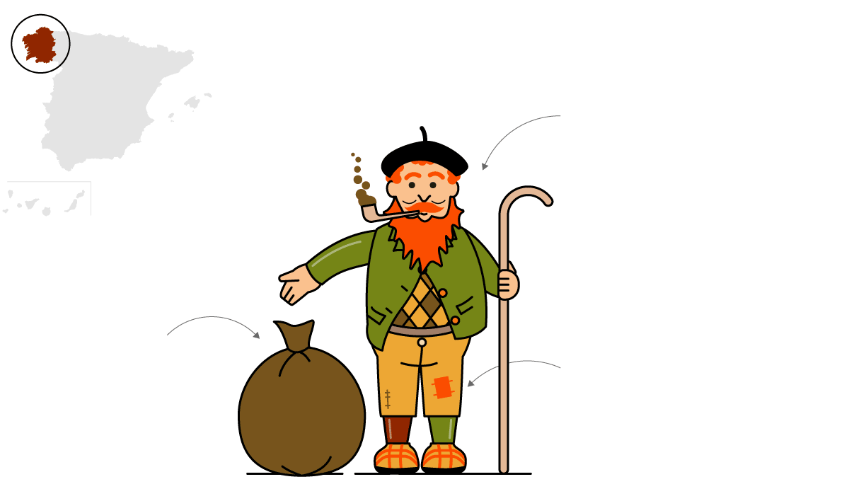 Galicia: Represéntase-y con barba pelirroxa, pipa y boína. Lleva un gran sacu con comida y regalos. Pantalones con romiendos