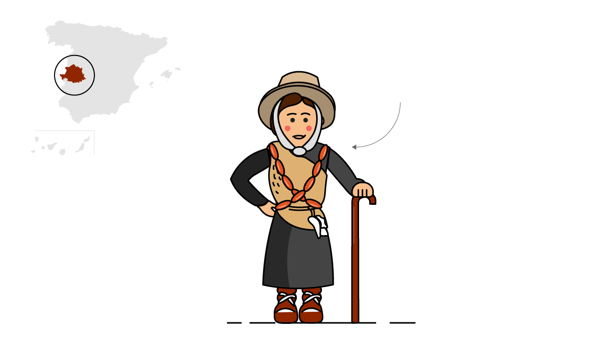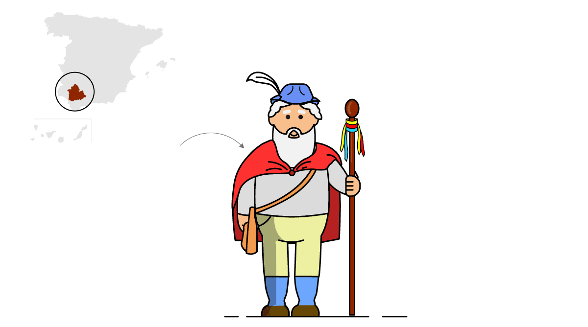 Les Hurdes, Estremadura. Empiezos d’avientu. Esta muyer baxa de la sierra na contorna de Les Hurdes, nos primeros díes d’avientu, pa dar empiezu a la matanza del gochu. Viste con pieles de cabra, un gorru de piel de rapiega o de llobu y lleva pieles d’animales colgaes de la petrina, amás de collares de panoyes de maíz y chorizos enroscaos. Suel llevar consigo xuna bixiga de gochu y un garrote.