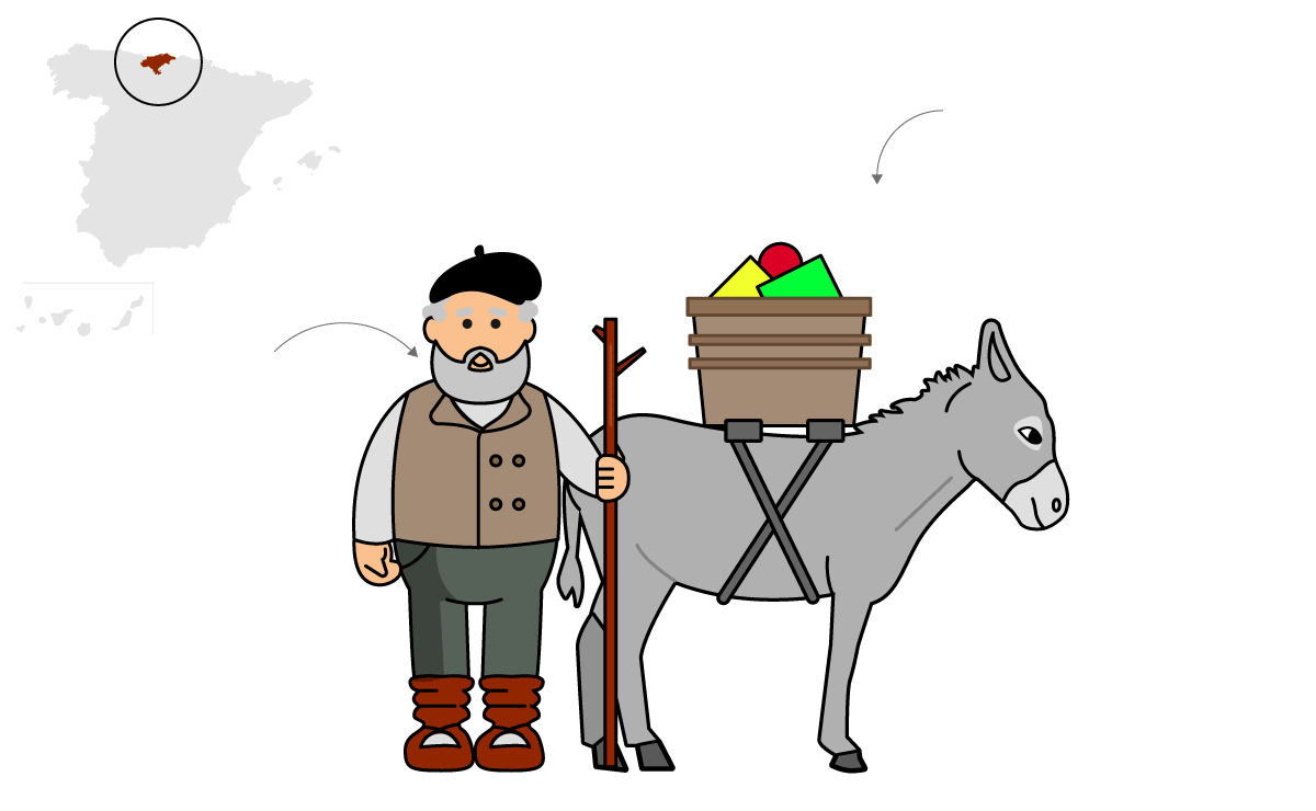 Cantabria: Va cargáu con xuna cesta de regalos. Tradicionalmente de madera. Llarga barba