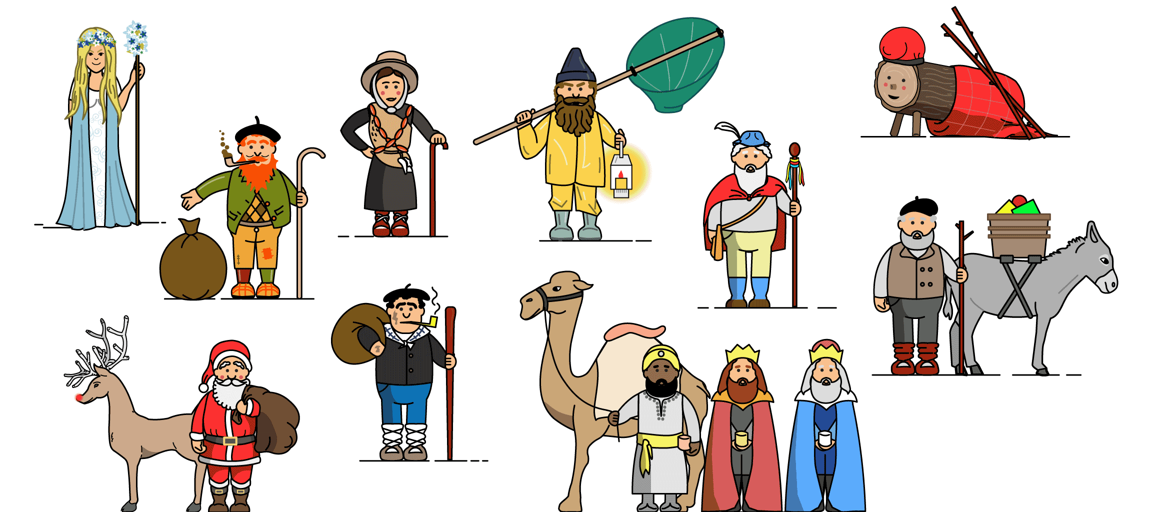 Un carboneru que baxa de los montes nel País Vascu; unes faes qu’ayuden a los más desfavorecidos en Cantabria; un home que toca les barrigues de los neños para comprobar que nun pasen fame en Galicia… y n’Écija, barganal de Sevilla. La xeografía española de los personaxes tradicionales de les navidaes ye variada. Munchos remonten el so orixe a fiestes paganes, dalgunos tienen sieglos d’antigüedá y otros pocu más d’una década, pero toos traen regalos (o ayuden a traelos). Repasamos les figures más destacaes del folclor navidiegu, de cutiu escaecíos detrás de Santa Claus y los Reis Magos.