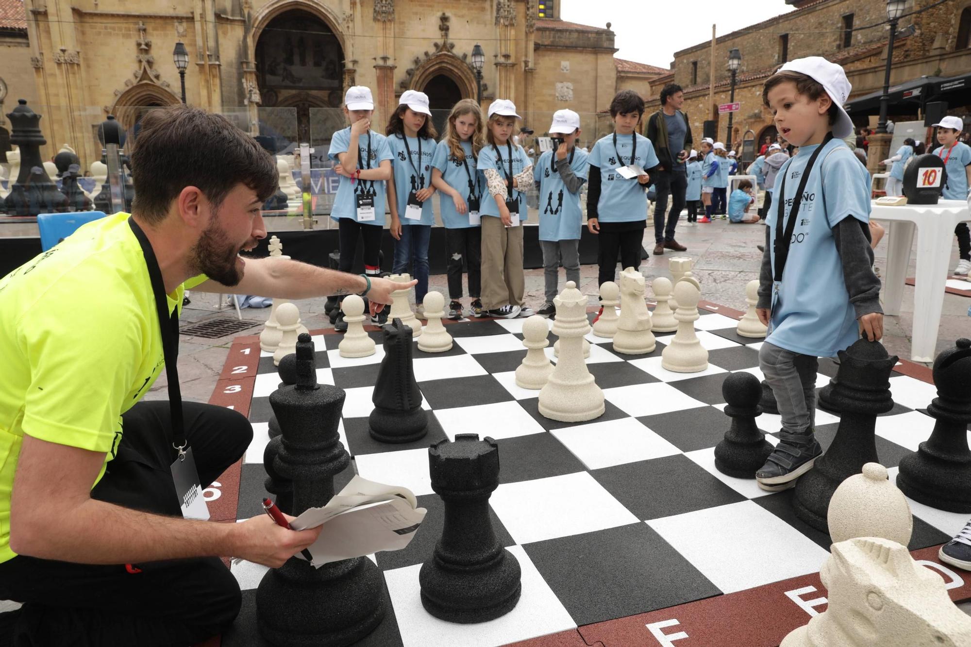 Aquellos qu’inda ponen en dulda que l’axedrez ye un deporte ye que nun se pasaron esti sábadu pola Plaza de la Catedral d’Uviéu. Más de doscientos neños de trenta colexos del conceyu xunen toles sos fuerces para mover les pieces de los tableros xigantes instalaos n’unu de los espacios más emblemáticos de la ciudá. Los pequeños axedrecistes remanen peonos, alfiles y reines de cauchu recicláu, neumáticos usaos reconvertíos en pieces de casi un metro d’altu y con pesos qu’esixen un esfuerzu que va muncho más allá del intelectual. Para da-y xaque al contrariu hai que sudar la gota gorda y xugar n’equipu. «Esto ye muncho más risonderu que xugar enriba d’una mesa. Para mover les fiches tenemos que coyeles ente dos o trés», esplica Chema Acebal, un neñu de les Dominiques que comparte equipu con otros compañeros de la so clase, como Elisa López o Diego Álvarez.