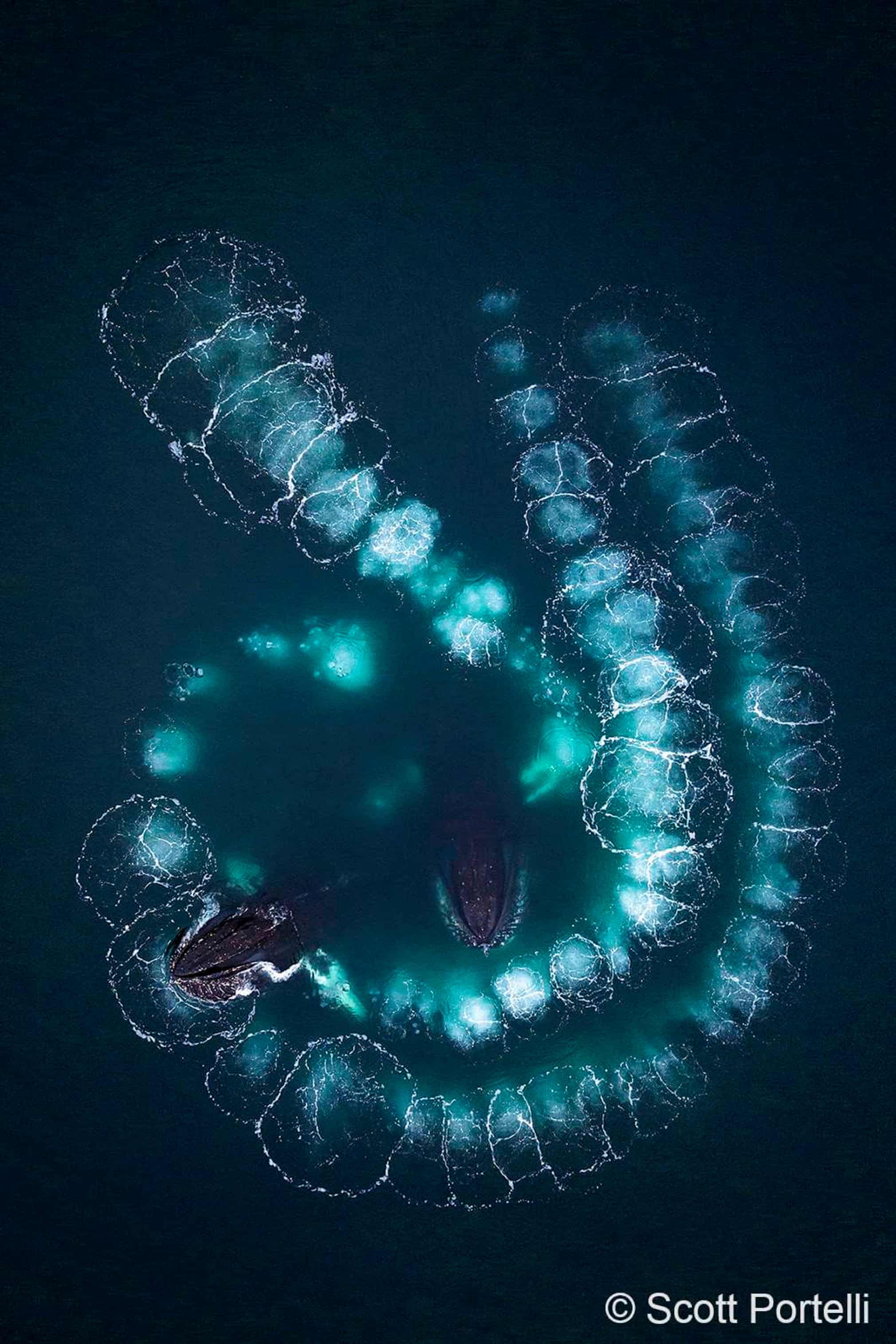 Una impresionante imaxe tomada dende un dron de dos ballenes gorrumbes alimentándose con una rede de burbuyes llevó’l primer premiu nel concursu Australian Geographic Nature Photographer of the Year 2024 nel Muséu del Sur d’Australia.
