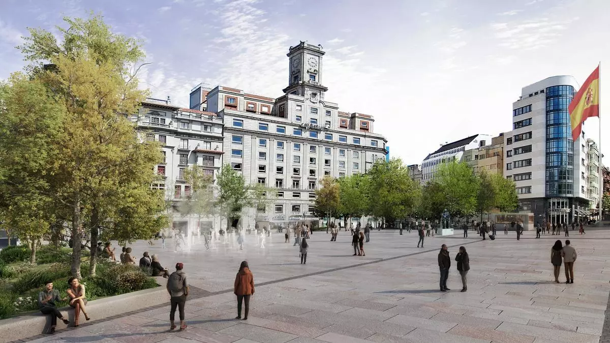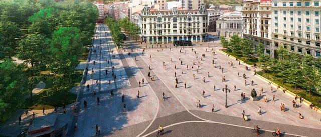Un gran salón urbanu que s’abrirá al Campoamor y al Antiguu. El diseñu de la plaza, ensin tráficu, preve remexos d’agua, grandes zones d’arboláu nes marxes, bancos corríos y un pequeñu aguaducho. Convertir la plaza de la Escandalera en «l’espaciu públicu más importante de la ciudá», «un gran salón urbanu» capaz de faer convivir l’alcuentru de los peatones, les conxustes y el descansu cola celebración de grandes espectáculos.