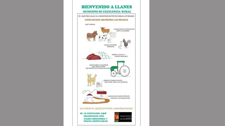Empezará asitiándose diez cartelos a la entrada de los valles, parroquies y ámbitos rurales del conceyu llaniscu y, darréu, van asitiase otros diez. Esti tipu d’iniciatives yá se lleva a cabu dende va años n’otros países como Francia y surdió cola idea d’alvertir a los visitantes sobro les singularidaes del mundu rural y les molesties y ventayes qu’estes trai.
