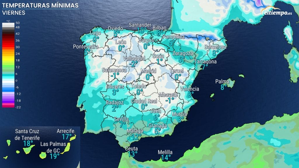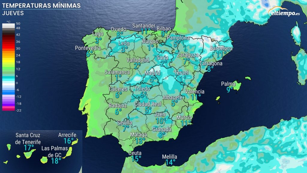Les mínimes del xueves van dase a la fin del día gracies a la entrada d’esi frente y l’aire frío que va llegar tres él. Les xelaes volverán estendese pol mapa y anque débiles, van afectar sobremanera a los montes de la metá norte peninsular y a puntos del Norte.