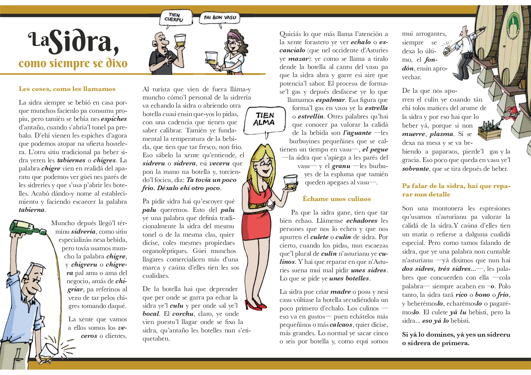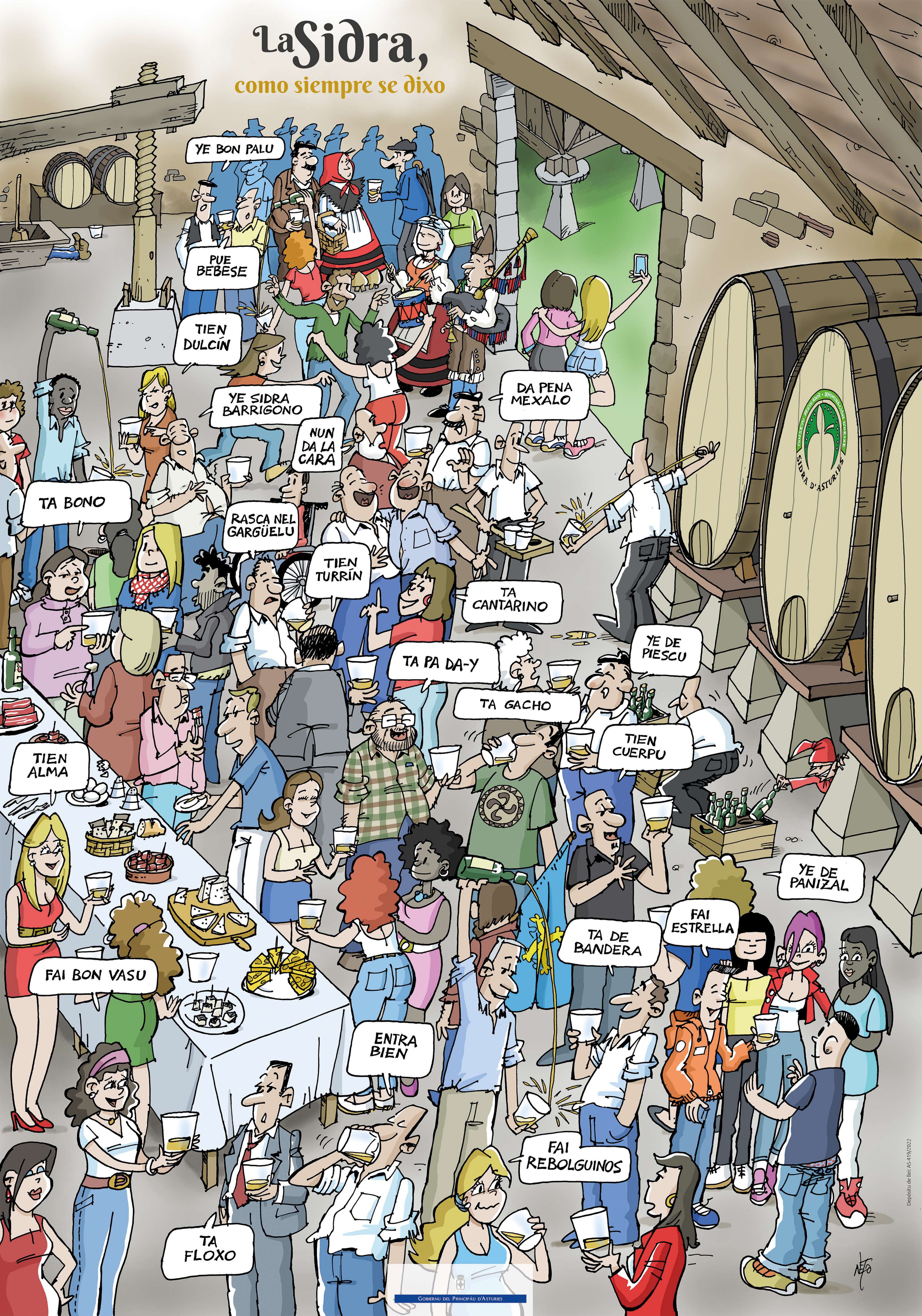 Los personaxes del cartel faen comentarios al respective de la sidra que tán bebiendo y pa eso usen delles de les munches espresiones tradicionales qu’existen n’asturianu pa valorar la nuestra bebida más identificativo: «Ta de bandera», «Fai bon vasu», «Pue bebese», «Ta cantarino», «Rasca nel gargüelu», etc.
