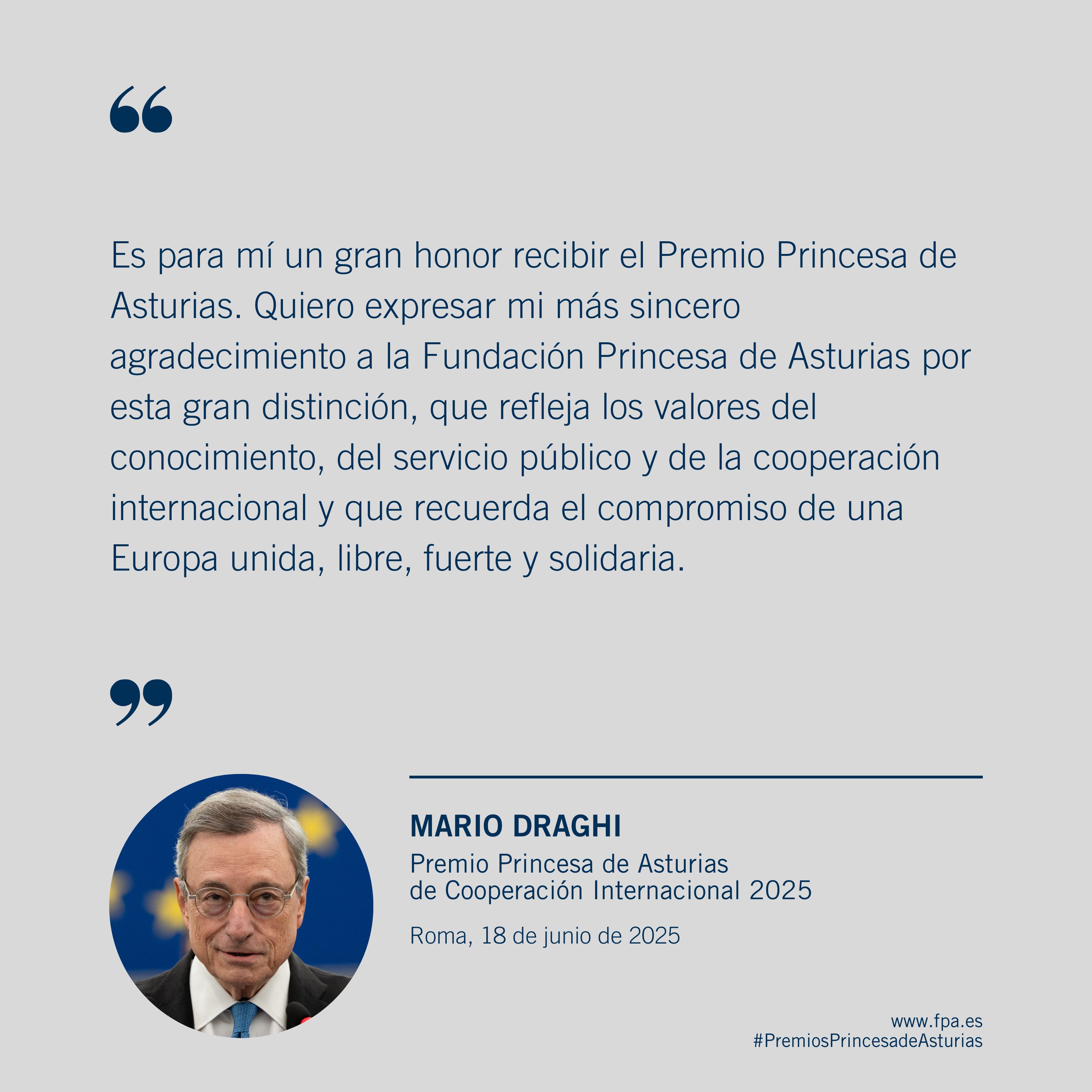 «A lo llargo de la so amplia trayectoria de más de cuatro décades, Draghi promovió’l multilateralismo, la cooperación ente los Estaos miembros y el fortalecimientu institucional y económico de la Unión, según el so papel na escena global», dexó escritu pa la hestoria un xuráu que lu define como «símbolu d’una Europa xunida, llibre, fuerte y solidaria».