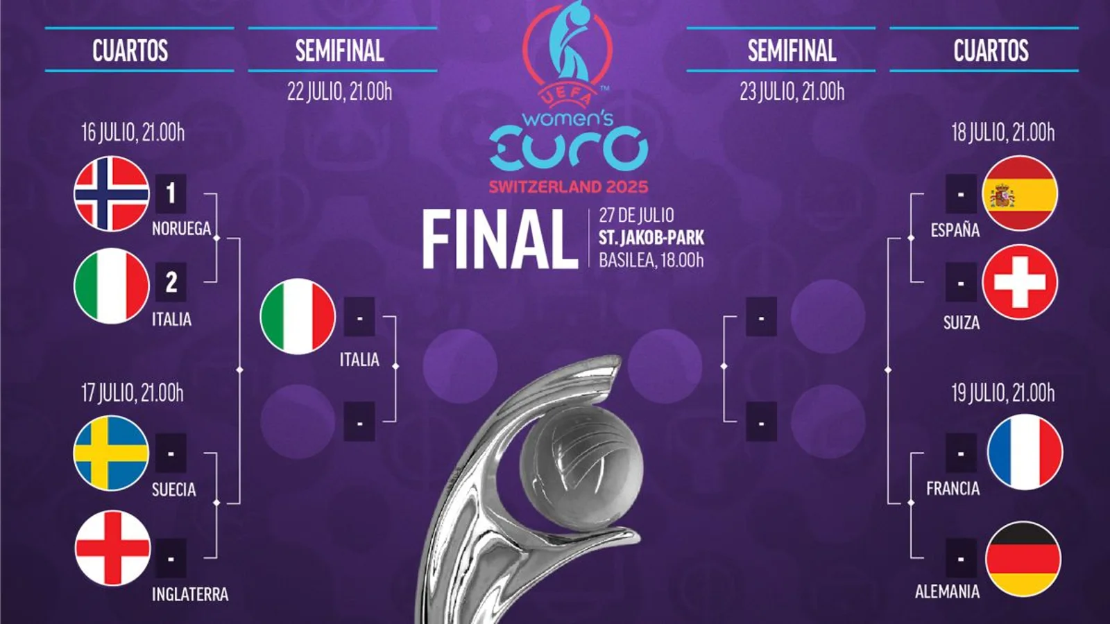 Llega esi momentu de la hestoria nel que les protagonistes pasen a convertise n’heroínes. Magar selecciones como Francia, Alemaña o Inglaterra partíen como favorites nos pronósticos iniciales, el rendimientu amosáu per España na fase de grupos asitiala agora como principal candidata al títulu. El so xuegu ofensivu, combináu cola esperiencia de les sos xugadores y l’impulsu del recién Mundial, faen que tea nun gran momentu competitivu.