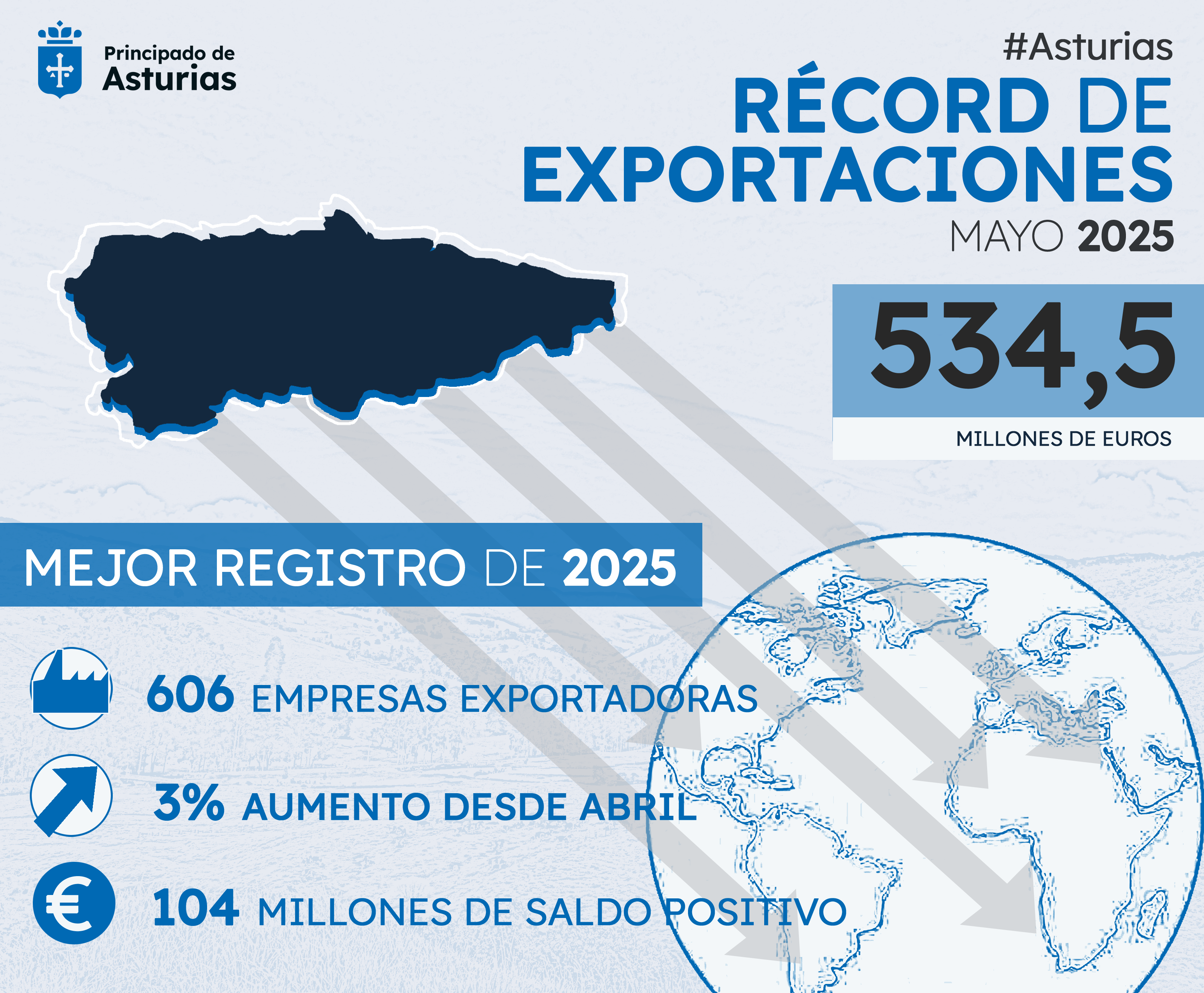 Les esportaciones asturianes marquen un nuevu récord en mayu magar la guerra arancelaria y l’inestabilidá xeopolítica. Les empreses vendieron productos y servicios per valor 534,5 millones, el meyor rexistro no que va d’añu. Un total de 606 compañíes del Principáu caltienen relaciones comerciales de manera habitual con otros países.