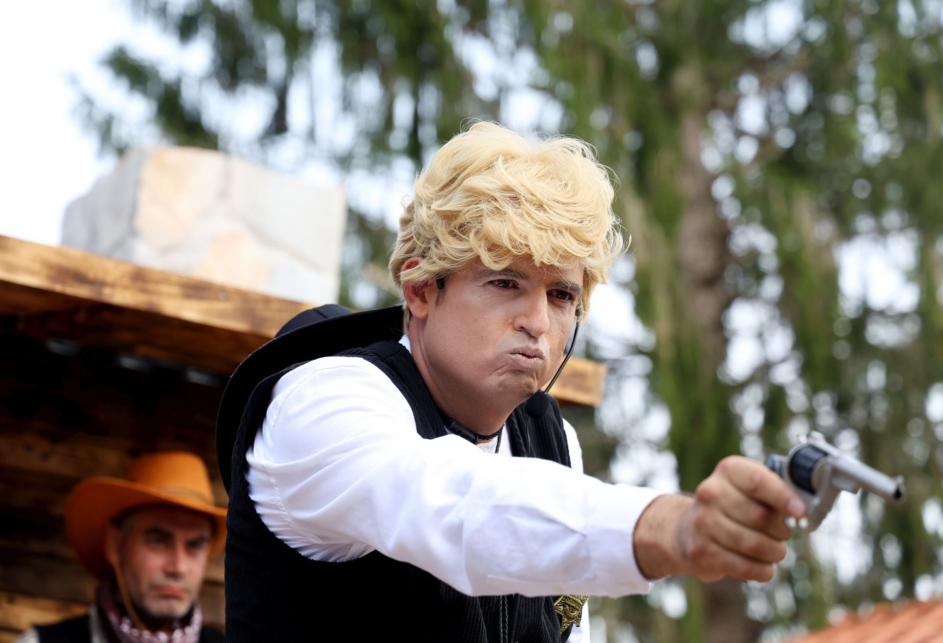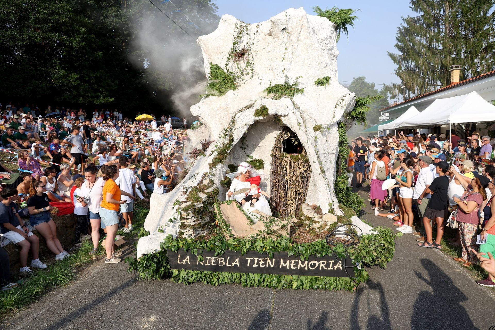Valdesoto pon el mundu de vuelta y media nos sos xarrés/carroces. Les peñes del tradicional desfile vencen al calor coles sos comedies rodantes ente la IA, los Blinders, Koldo yTrump. LNE /. Semeyes / El Comercio./ Videu /