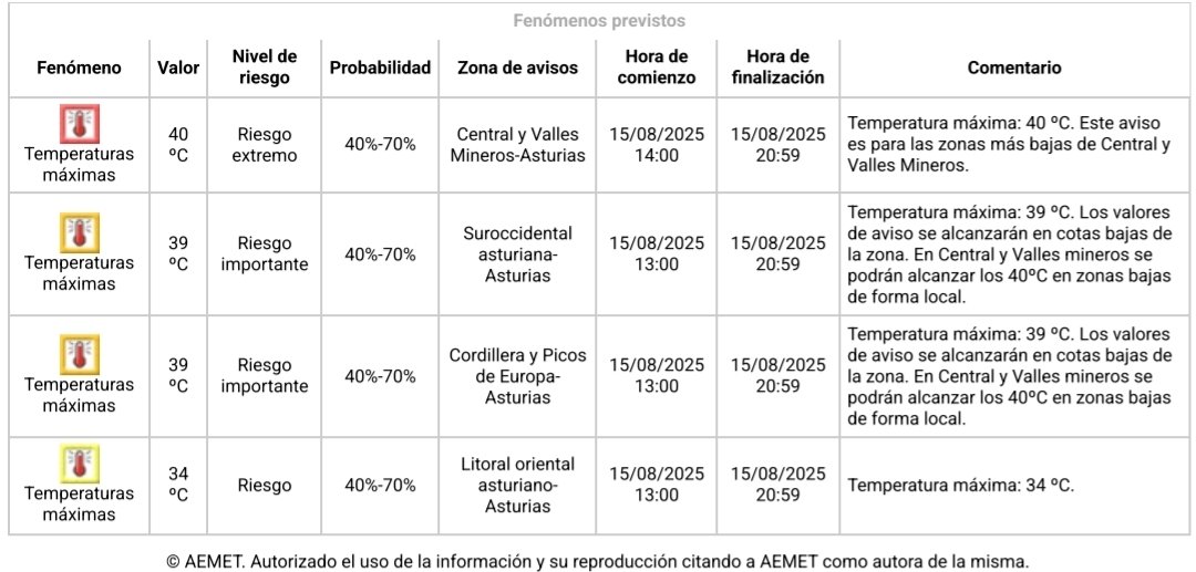 Tabla d’avisos vixente n’Asturies nesti momentu. Avisos COLORÁU, naranxes y mariellu por temperatures máximes, güei vienres 15 d’agostu. Avisos actualizaos na web d’AEMET: aemet.es/es/eltiempo/pr