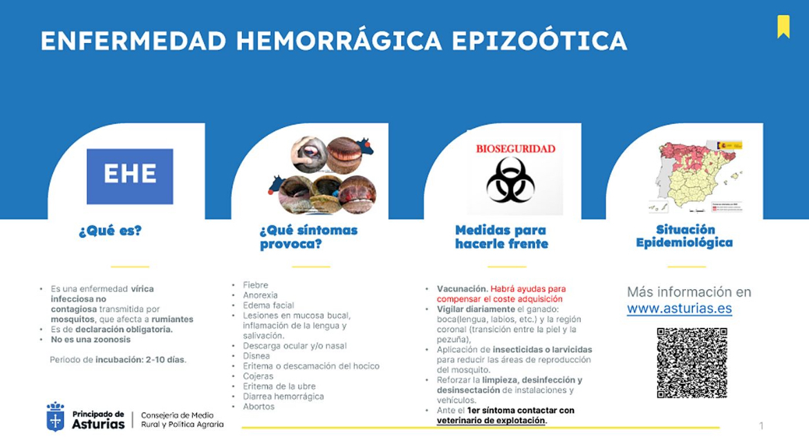 La Conseyería de Mediu Rural y Política Agraria d’Asturies encamienta reforzar les midíes de bioseguridá nes esplotaciones ganaderes. Esti encamientu débese al aumentu d’enfermedaes tresmitíes por mosquitos en rexones estremeres. Anque Asturies permanez llibre d’estes patoloxíes, aconséyase la desinfección d’instalaciones y vehículos, la cuarentena d’animales recién llegaos y la restricción de movimientos dende zones afectaes.