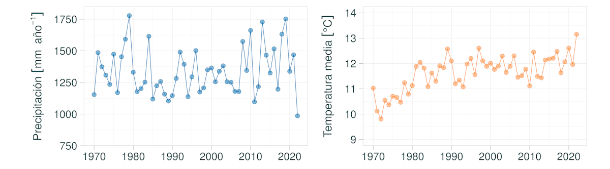 Enclín en precipitación (esquierda) y temperatura medio (derecha) pal conxuntu d’Asturies mientres el períodu 1970-2022. El autores, CC BY-SA