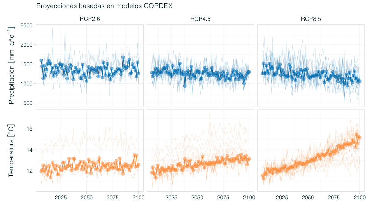Enclinos na precipitación añal y temperatura medio basaes na rexonalización de les simulaciones EURU-CORDEX. L’escenariu RCP2.6 representa xuna estratexa de mitigación estricta que correspuende a los oxetivos del Alcuerdu de París. L’escenariu RCP 4.5 representa xuna estratexa basada nel desenvolvimientu de tecnoloxíes de mitigación. L’escenariu RCP 8.5 promueve el desenvolvimientu económicu rexonal y un aumentu sosteníu del consumu. Considérase un escenariu de riesgu desconocío y que podría llevar a una interferencia peligrosa col clima.