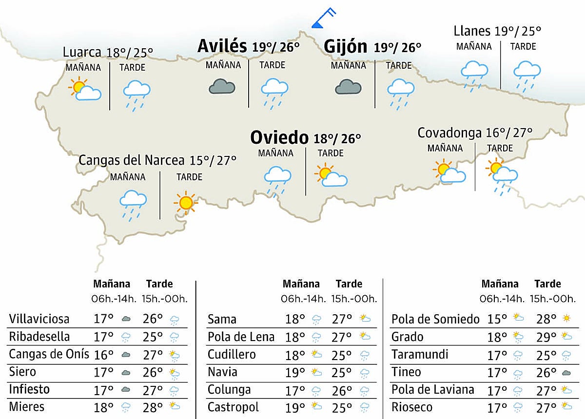 Vamos tener un respiru cuidao que van baxar les temperatures. Na metá sur del Principáu van baxar les máximes ente 4 y 6 ºC, ente que na metá norte van baxar de forma más moderada. Les mínimes, sicasí, van xubir respectu al llunes. En cuanto al estáu de los cielos, vamos amanecer con nubes que van sumir a partir del mediudía anque van tar presentes intervalos de nubes altes. A lo llargo de la tarde van entrar nuevamente nubes baxes pola mariña que se van estender escontra l’interior pela nueche. Les precipitaciones van ser poco probables, pero nun se refuga que pueda escapase dalgún orbayu poco importante a partir de #tardar en zones costeres y otros puntos cercanos.