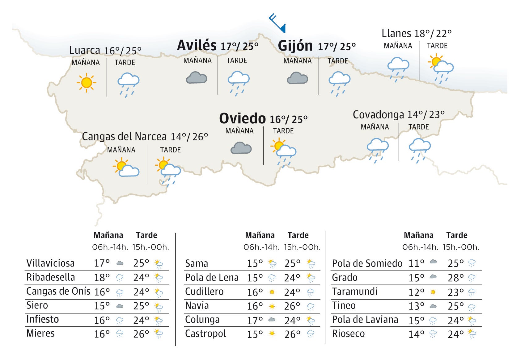 Los vientos van ser fluexos de primeres pero, mientres la segunda parte del día, van soplar de componente oeste con raches moderaes. Ye posible que, pela nueche, puedan rexistrase delles raches daqué más fuertes na mariña occidental que podríen superar los 50 km/h. Tocantes a les temperatures, van baxar en tol sur del Principáu tantu nel casu de les máximes como nel de les mínimes. Nel restu d’Asturies van caltenese ensin cambeos al respective de les anotaes esti martes.