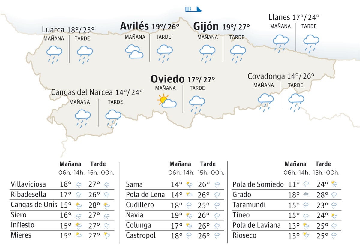 La previsión obliga a activar l’avisu mariellu costeru hasta les 12 del mediudía por fuertes vientos mar adientro y la posibilidá de foles d’hasta 4 metros d’altor. Espérase que na mariña puedan superase los 60 o 70 km/h. Escontra l’interior les raches van ser moderaes d’hasta 40 o 50 km/h, anque va haber puntos de monte que podríen tamién superar los 60 km/h.