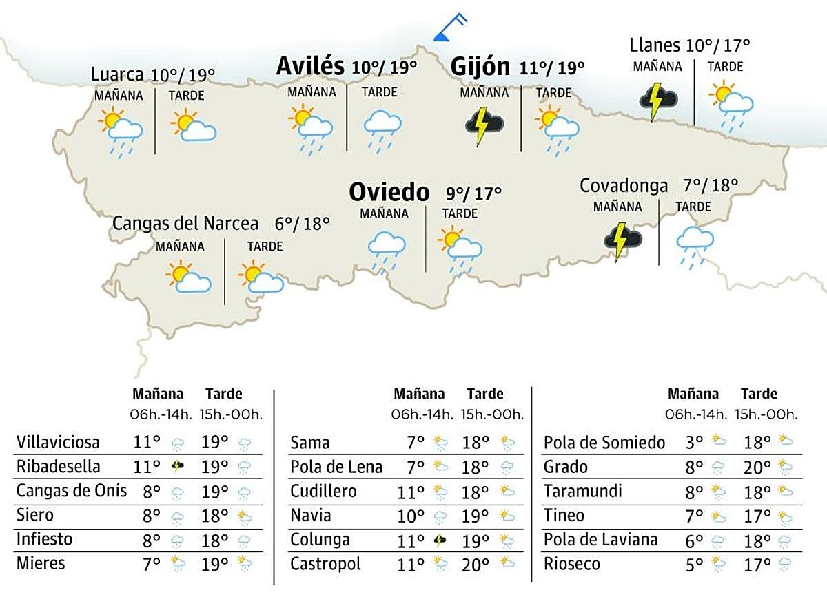 Tres les agües d’esti llunes coles qu’empecipiábamos la estación serondiega, güei martes va dir ameyorando’l tiempu claramente en comparanza coles condiciones meteorolóxiques. Anque vamos amanecer con cierta nubosidad, vamos reparar cómo se van dir abriendo claros nel cielu a midida que vaigan trescurriendo les hores. Asina tou, nun se refuga que pueda escapase dalguna gota mientres la primer metá del día, sobremanera nel sector oriental. Los vientos van predominar de componente este con delles raches moderaes especialmente na mariña. Les temperatures máximes van xubir en tol Principáu. Nel cordal y suroccidente hasta 5 graos al respective de la xornada anterior, nel restu del interior hasta 4 graos más, y na mariña y zones próximes hasta 3 graos. Les mínimes van caltenese a esceición del sector central onde van baxar.