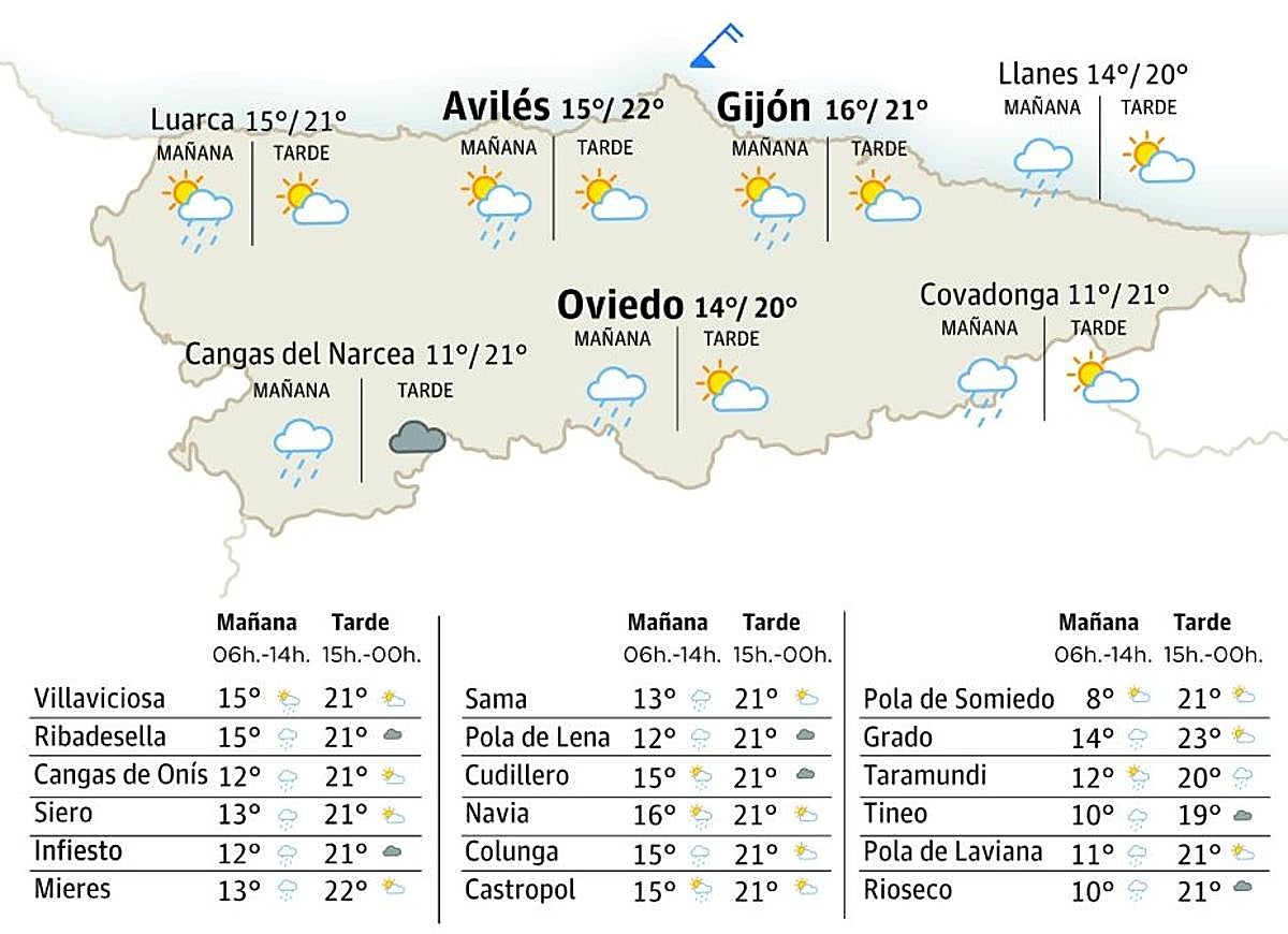 El martes, anque vamos empezar la xornada entá con cierta nubosidá vamos reparar como les nubes van ser cada vez menos compactes a lo llargo del día. Nun s’esperen precipitaciones en nengún momentu. Les temperatures diurnes van xubir un par de graos respecto al llunes, salvu nel cuadrante nordés onde nun van esperimentar variaciones. Les mínimes van baxar sobremanera na zona central d’Asturies.
