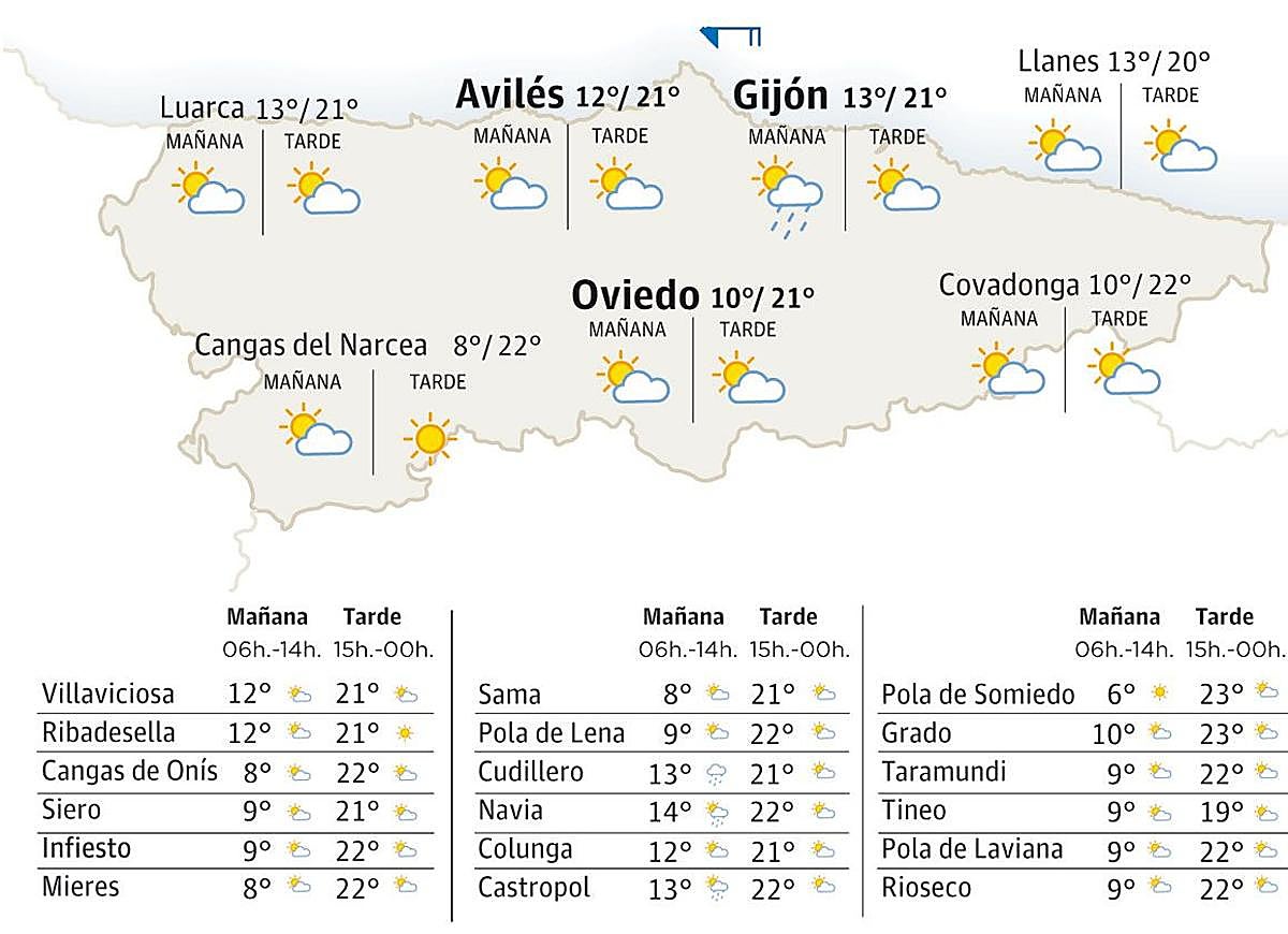 Al marxe de la envernada que ta sufriendo’l llevante peninsular onde esti llunes hubo poblaciones que superaron los 300 llitros per metro cuadráu mientres el día, la previsión del tiempu n’Asturies para esti martes agora nel Principáu unes condiciones meteorolóxiques muncho más estables. Anque vamos poder amanecer con delles nubes principalmente nel norte de la rexón, los cielos van tender a estenase prácticamente por completu. A lo llargo de la tarde nueche nun se refuga que pueda volver apaecer daqué de nubosidá, preferentemente escontra l’oriente y mariña, pero los cielos volverán llimpiase de nubes na madrugada. Los vientos van soplar de componente esti fluexos nel interior y moderaos na mariña. Les temperatures máximes van xubir llixeramente salvo na mariña oriental y proximidaes onde se van caltener ensin cambeos. Les mínimes van baxar na mayor parte d’Asturies y van facelo especialmente nel centru de la rexón.