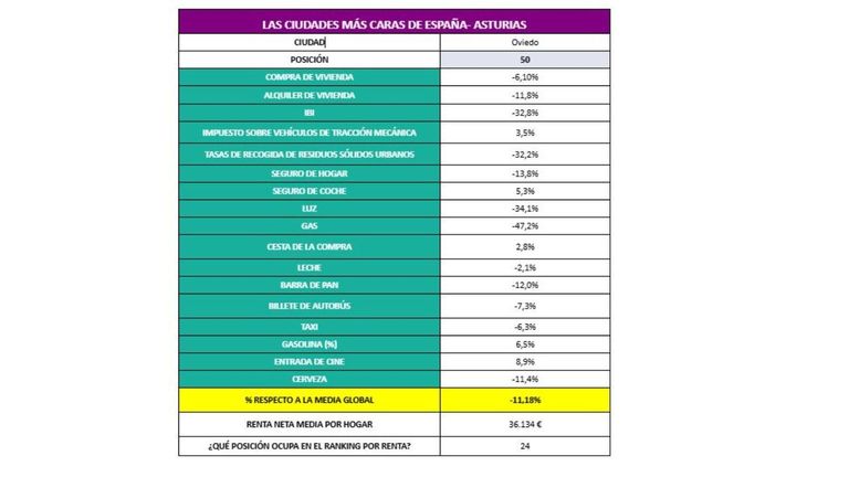 Precios de la vivienda ya impuestos, ente los más baxos. Uviéu destaca pola so posición favorable nos precios de la vivienda, siendo la vigesimocuarta ciudá más barata p’arrendar, con un costu un 11,8 % per debaxo del promediu nacional. Tocantes a la compra de vivienda, los precios son un 6,1 % inferiores a la media, lo que la alluga nuna posición entemedia del ranking, nel puestu 20.