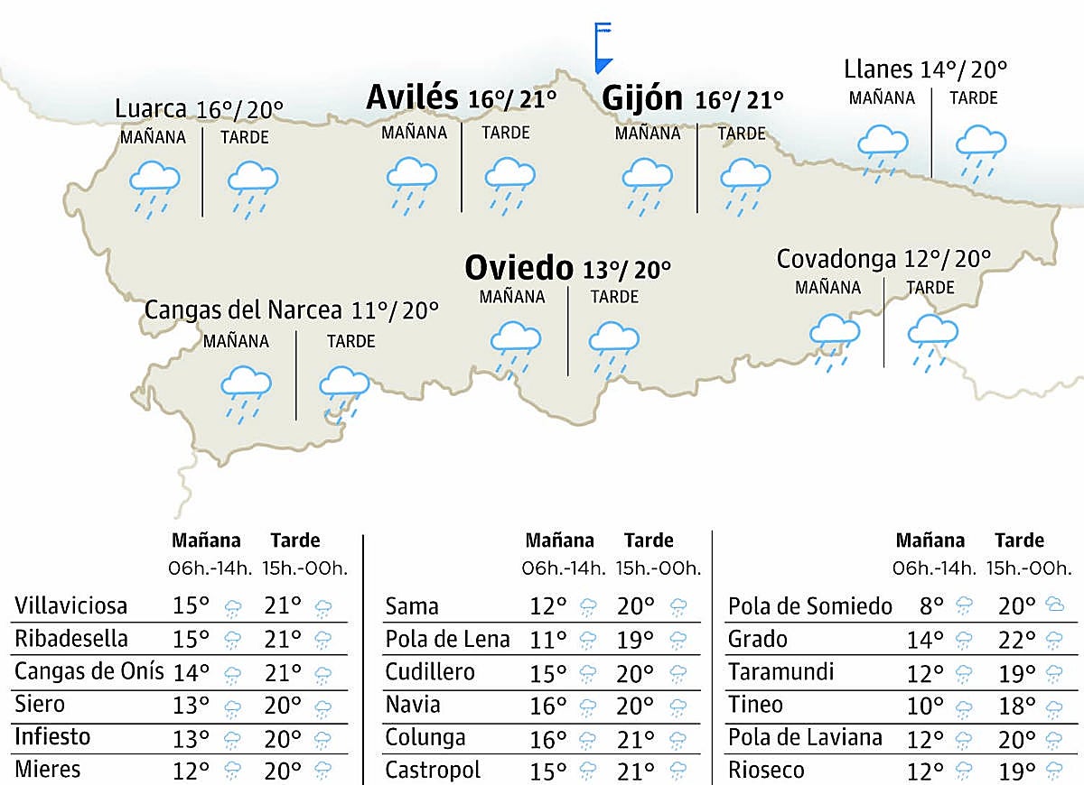 Esperamos un día marcáu pola nubosidá. Tantu pela mañana como pela tarde les nubes van tar presentes nel cielu, anque nel casu de la tarde nun se refuga que puedan ser daqué menos compactes. Les precipitaciones nun se refuguen pero, asina tou, van ser débiles o bien débiles. Los vientos van predominar de nordés-esti con posibilidá de raches moderaes especialmente na mariña. Les temperatures máximes van baxar na metá sur asturiana ente unu y dos graos, salvo en zones altes del cordal onde podríen baxar hasta 3 ºC. Na metá norte, sicasí, nun van esperimentar variaciones significatives. Les temperatures mínimes van xubir bien llixeramente na mariña y nel occidente, van #caltener nel restu.