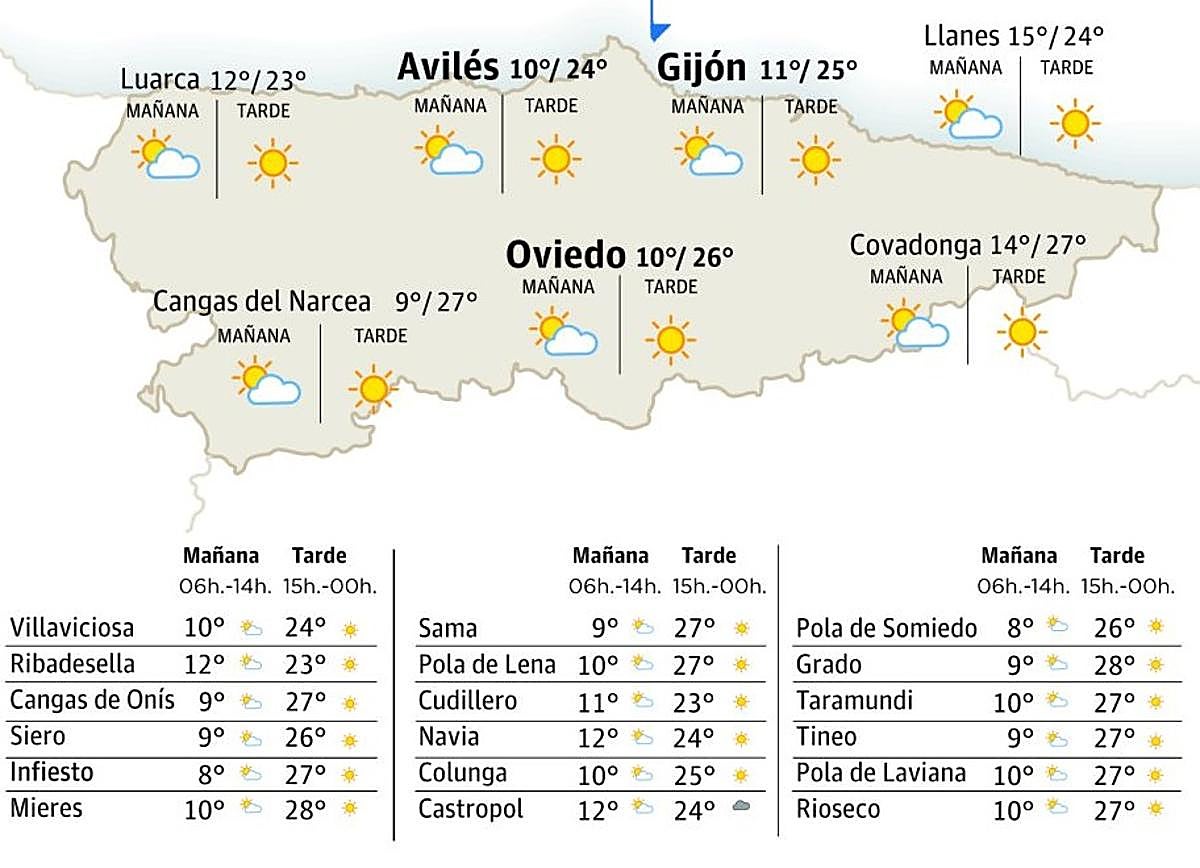 Esperamos una xornada estable na que van predominar los grandes claros en tol Principáu d’Asturies. A lo sumo, van poder apaecer dellos intervalos de nubes altes ensin importancia a lo llargo del día. La probabilidá de precipitaciones va ser rotundamente nula. Los vientos van predominar de componente este na mariña con raches moderaes, ente que nel interior los vientos van ser fluexos. Les temperatures máximes van xubir de forma xeneralizada. Esti ascensu va ser d’hasta 2 ºC nel occidente, hasta 3 o 4 ºC nel centru, y nun se refuga que puedan xubir hasta 5 ºC respectu al miércoles nel interior oriental. Tocantes a les mínimes, van ser bien similares. Sía que non van poder xubir bien llixeramente en Picos d’Europa y tamién nel suroccidente.