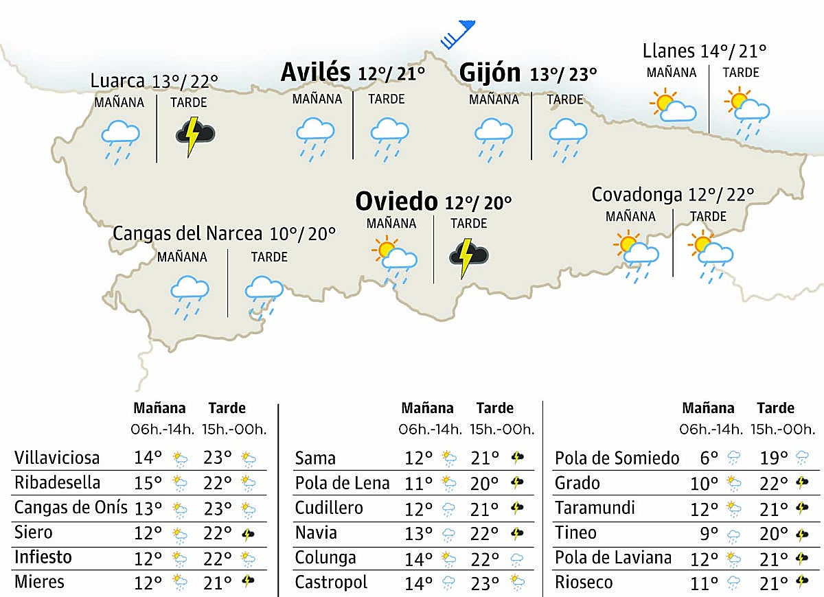 El xueves, día nublu pela mañana con agües xeneralizaes que van unviar pela tarde pudiendo abrise claros. Temperatures en descensu y vientos moderaos de componente oeste.