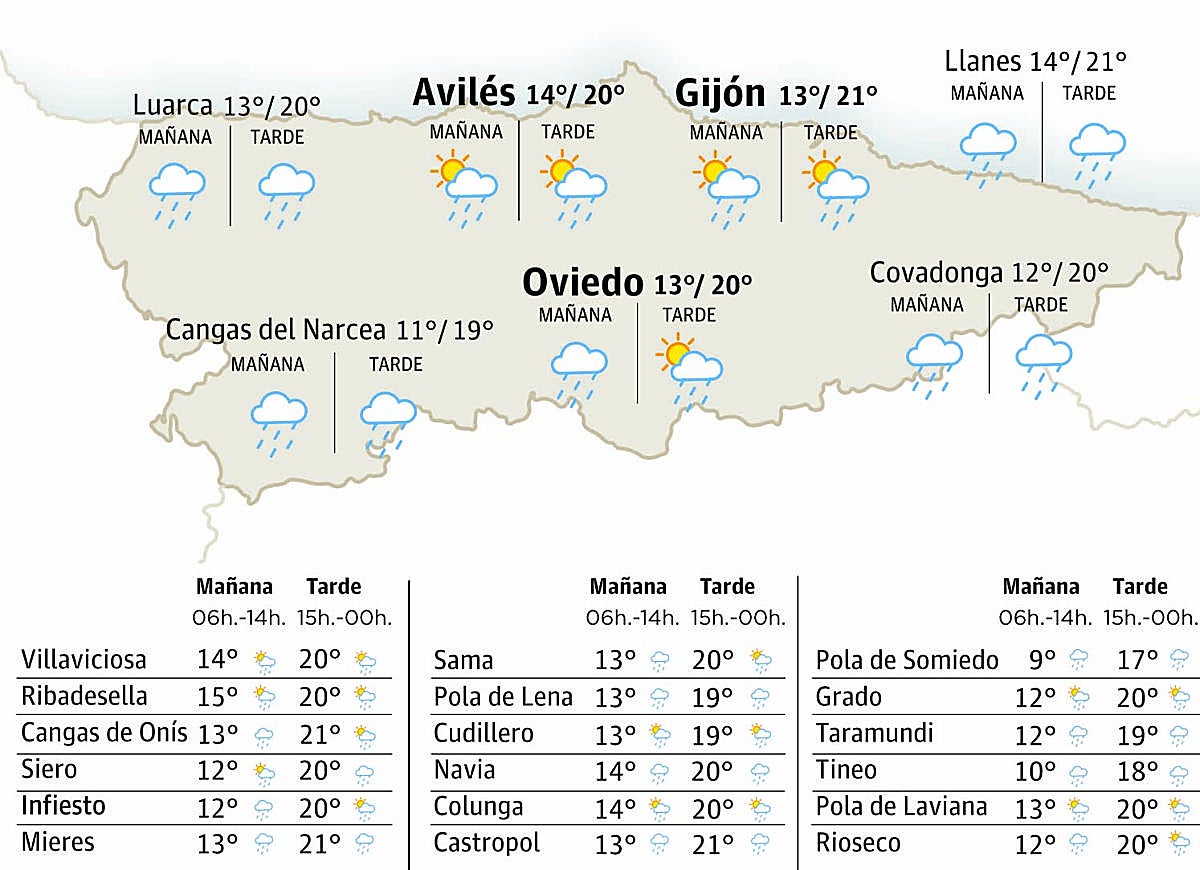 En cuanto al estáu de los cielos, van predominar los intervalos de nubes medies y altes polo xeneral. La única esceición va tener llugar nel cordal y zones próximes onde sí s’esperen nubes baxes que van dexar precipitaciones que podríen ser persistentes mientres tol día. Estes agües van ser pocu probables nel restu de la rexón y, especialmente, cuanto más movamos escontra’l norte y oriente asturianu. Les temperatures máximes van ser bien prestoses anque, posiblemente, baxen nel casu de les máximes respectu al miércoles.