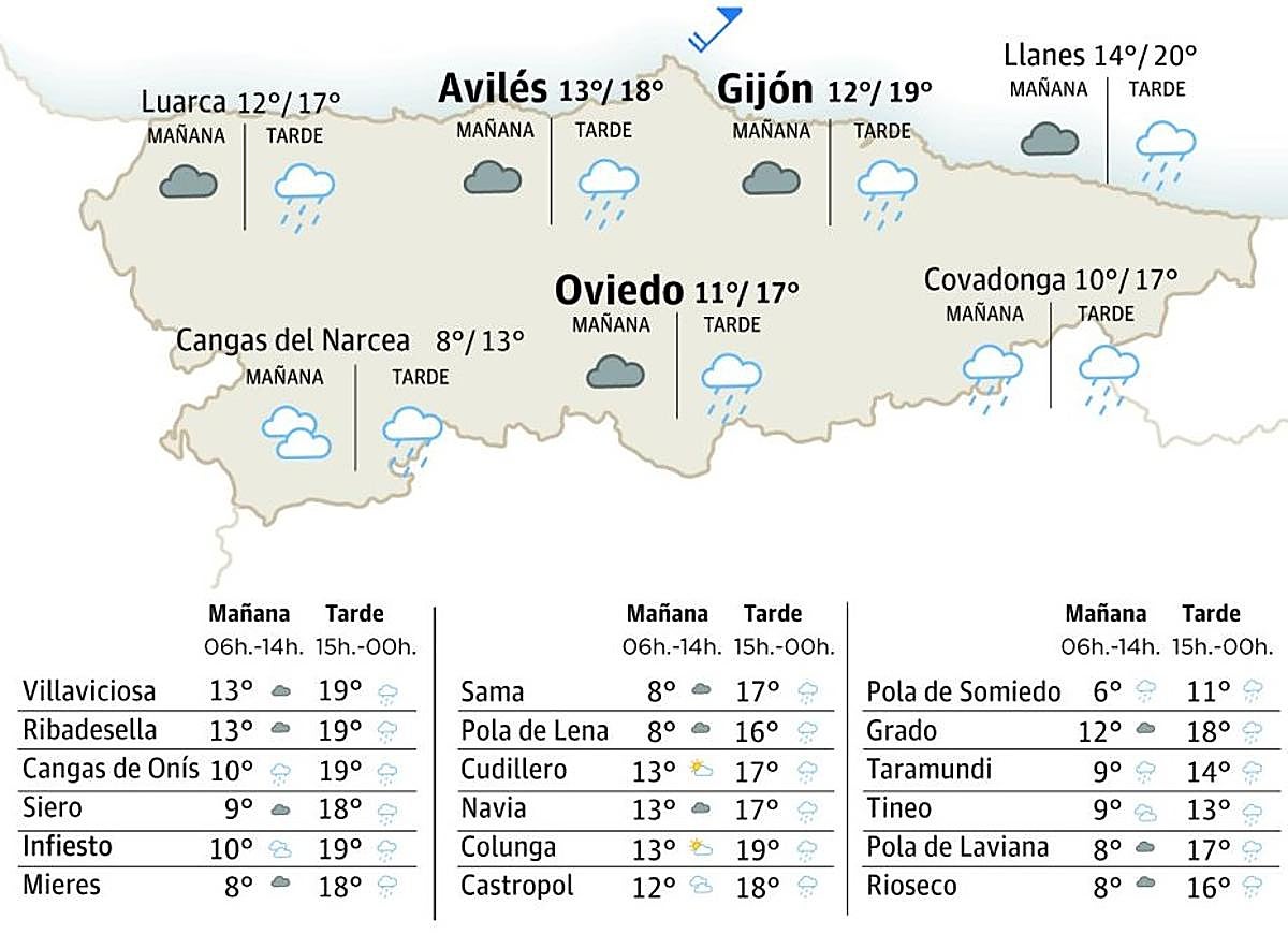 Esperamos intervalos de nubes medies y altes pela mañana con una probabilidá de precipitaciones bien baxa o prácticamente inesistente. Mientres la segunda metá del día nun se refuguen precipitaciones nel cordal y tamién nel suroeste. A la fin de la tarde tamién s’esperen delles agües nel restu del occidente y, antes de concluyir el día, ye posible que puedan escapase bien sele n’otros puntos del Principáu. Los vientos van soplar de suroeste moderaos mientres casi tol día. Estos vientos van consiguir que xuban les temperatures tanto nel casu de les máximes como nel de les mínimes. Les diurnes van xubir hasta 2 o 3 ºC, inclusive hasta 4 ºC en puntos del centru ya interior oriental. Les mínimes van xubir de forma estraordinaria ente 8 y 10 ºC respectu al sábadu polo que vamos amanecer con un ambiente térmico bastante más prestosu.