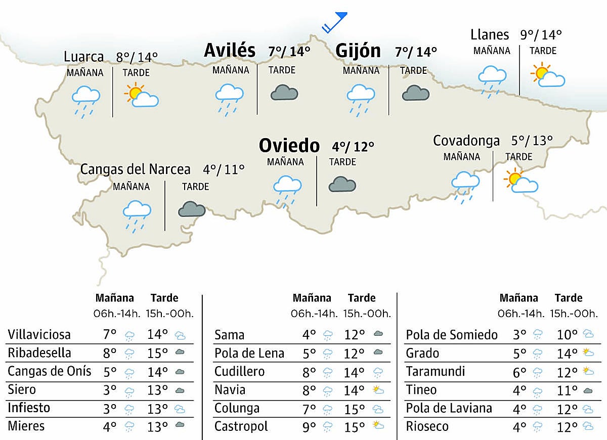 Espérense cielos nublos o bien nublos otra vegada anque nun se refuga l’apertura de delles escamplaes a la fin del día. Les precipitaciones van tar presentes entá pela mañana y van tender a dir unviando de cara a la segunda parte de la xornada. Estes precipitaciones entá podríen ser localmente moderaes nes primeres hores de la mañana dexando nieve a partir de los 1200 metros d’altor. Conforme vaiga trescurriendo’l miércoles la cota va dir xubiendo hasta los 1500 o 1600 metros anque, como acabamos de comentar, apenes s’espera inestabilidá pela tarde. Los vientos van ser fluexos y variables con delles raches moderaes sía que non na mariña y en zones altes del cordal. Tanto les temperatures máximes como les mínimes van xubir de forma llixera namá nel suroccidente asturianu. Nel restu del Principáu van caltenese ensin grandes cambeos al respective de les anotaes el martes.