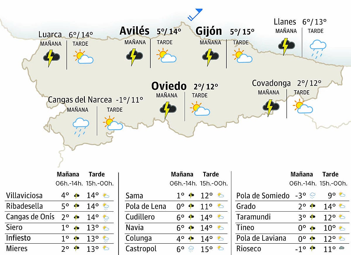 Esperamos una mañana con bastios que podríen afectar a cualquier puntu de la rexón. La cota de nieve va rondar los 1000 metros a primeres hores de la mañana, con enclín a xubir hasta los 1200 metros progresivamente. De cara a la tarde, anque nun se refuga que pueda escapase entá dalgún bastiu, la inestabilidá va dir a menos hasta acabar unviando por completu. Mientres el tramu final del día abrirán grandes claros pudiendo quedar los cielos poco nublos. Los vientos van soplar de componente norte moderaes pela mañana, van acabar siendo fluexos y variables col intre de la tarde, y finalmente van poder soplar de sur al concluyir el día. Les temperatures máximes van baxar en tola Comunidá Autónoma. Esti descensu va ser más significativu nel cordal y nel oriente (hasta 4 o 5 ºC menos que’l sábadu). Nel casu de les mínimes, el descensu va ser más notable pudiendo baxar hasta 6 ºC nel interior especialmente.