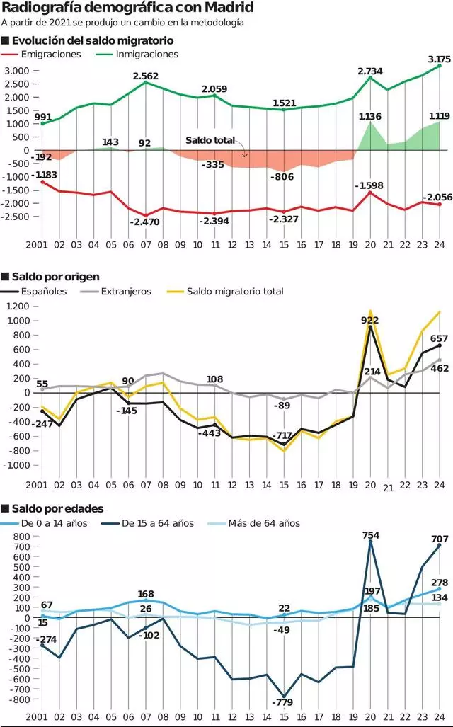 Pero foi a partir de 2020 cuando l’enclín dio la vuelta como un calcetu. Asturies empezó a rexistrar dende entós un saldu positivu, atrayendo a más persones procedentes de Madrid de les que se diben. L’añu del covid, el saldu migratoriu yá foi bien favorable a Asturies, en gran midida poles facilidaes concedíes pol teletrabayu. Los dos años posteriores, 2021 y 2022, Asturies siguió recibiendo más persones procedentes de Madrid de les que se diben, anque en menor midida, pero’l fenómenu amontóse los dos años siguientes. En 2023, el saldu con Madrid foi favorable para Asturies en 858 persones, y en 2024 esa cifra xubió a 1.119, comparable a la que se rexistró l’añu de la pandemia.