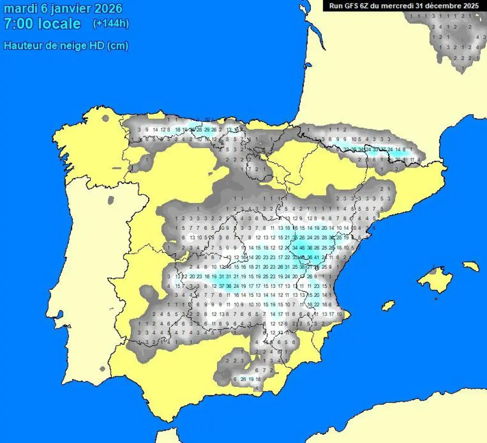 Nel mapa del portal Meteociel.fr, apréciase, en tonos grises y azules, les árees nes que’l modelu GFS preve que se produzan acumuladures de nieve. Les árees azules son aquelles nes que podríen superar amliamente los 20 y hasta los 30 centímetros, lo que podría suponer amplies acumuladures de nieve pel centru penínsular que nun se rexistren dende la nevarada Filomena, nel añu 2021.