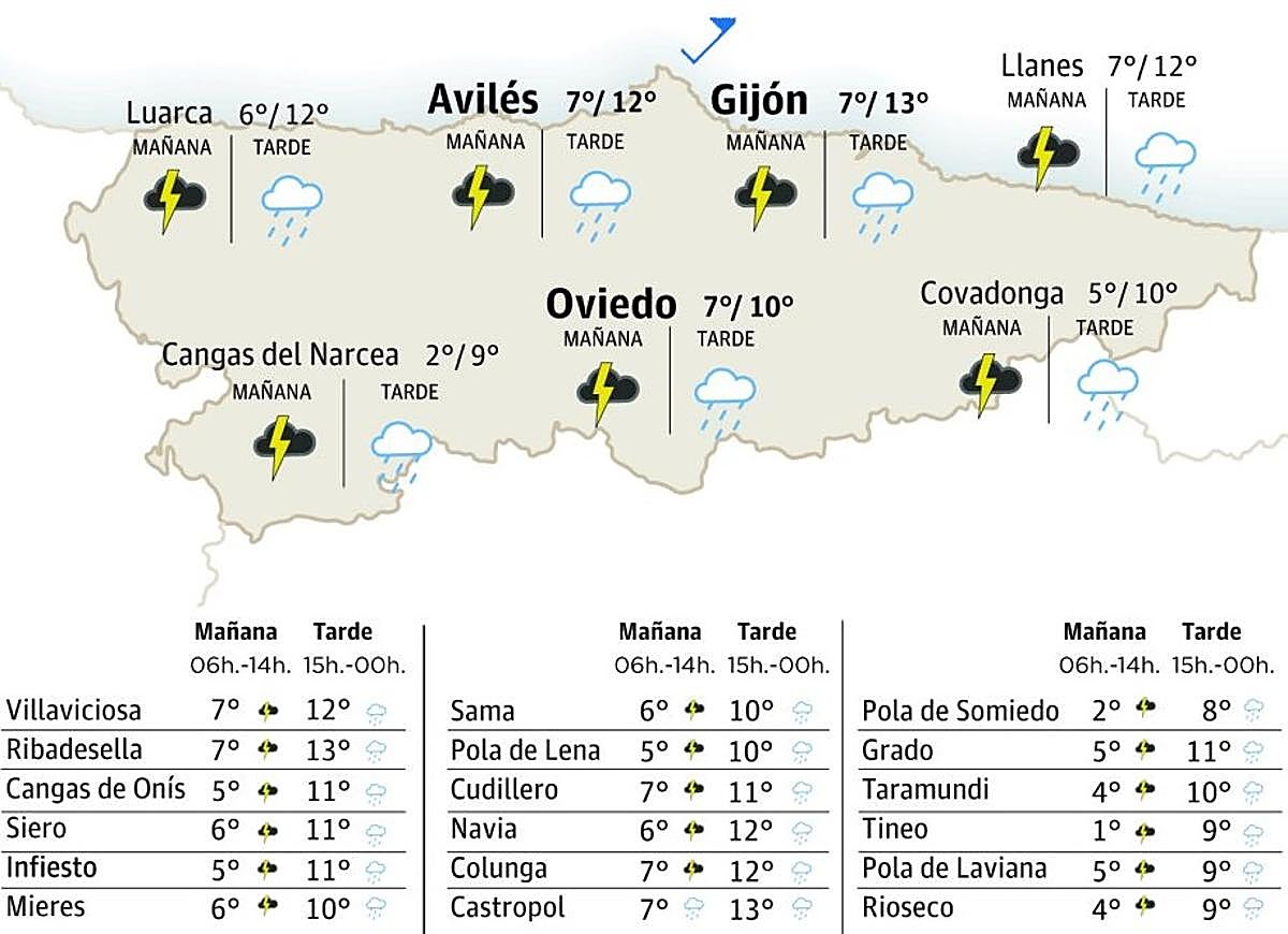 Esperamos cielos bien nublos con bastios xeneralizaos que van ser más abondosos mientres la mañana. La zona central y oriental van ser les más afectaes pero tamién s’esperen agües nel occidente. La cota de nieve va empezar sobro los 900 metros y va dir xubiendo hasta los 1100 metros nes hores centrales, pudiendo baxar a los 1000 a la fin de la xornada cuando les precipitaciones van ser muncho menos probables y, inclusive, inesistentes. Les temperatures máximes apenes van variar al respective de les anotaes el sábadu. Les mínimes van caltener nel occidente y van xubir nel restu del Principáu, especialmente na zona central asturiana. Los vientos van soplar de componente norte con raches moderaes.