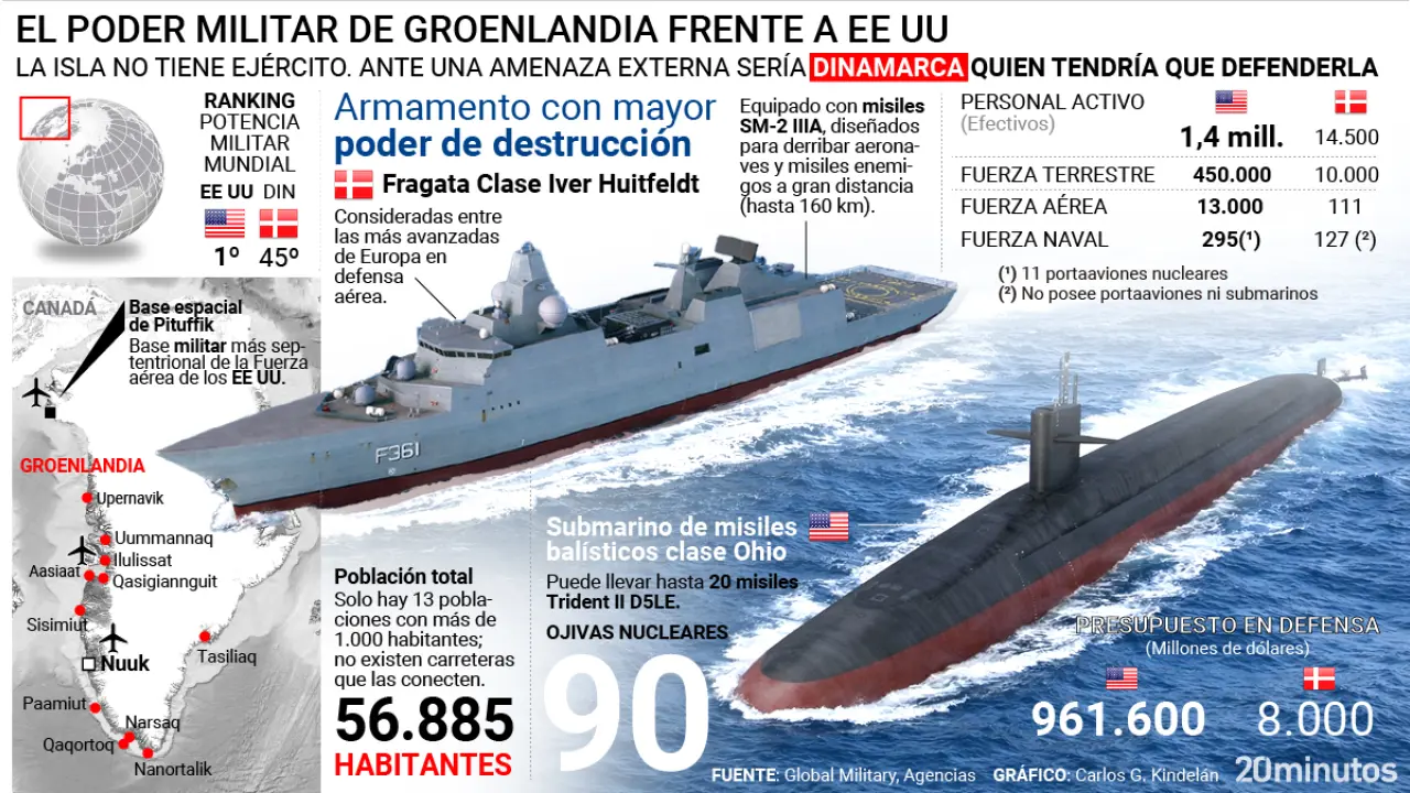 Con qué fuerces cunten Groenlandia y Dinamarca para responder a una agresión militar d’EEXX. Groenlandia nun tien exércitu. Del so defensa ocúpase Dinamarca, que ye la 45ª fuerza militar del mundu.