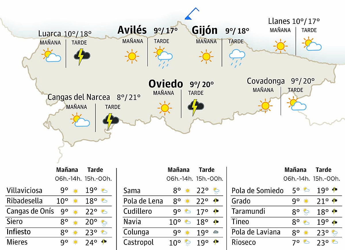 Nun va faer fríu pero tampoco la sensación templada del martes. Hasta 5 o 6 ºC menos que se van anotar na zona centro d’Asturies, y hasta 3 o 4 ºC menos nel restu salvu nel cordal onde apenes van variar al respective de les rexistraes el martes. En cuanto al estáu de los cielos, prevense intervalos de nubes altes sobremanera na primer parte del día. A lo llargo de la tarde vamos reparar como les nubes dirán estenándose y los cielos van acabar prácticamente estenos. Los vientos van soplar de sur moderaos pero van acabar siendo fluexos y variables a partir de la tarde.